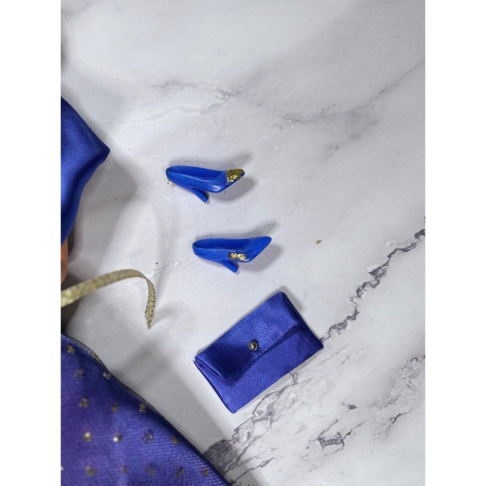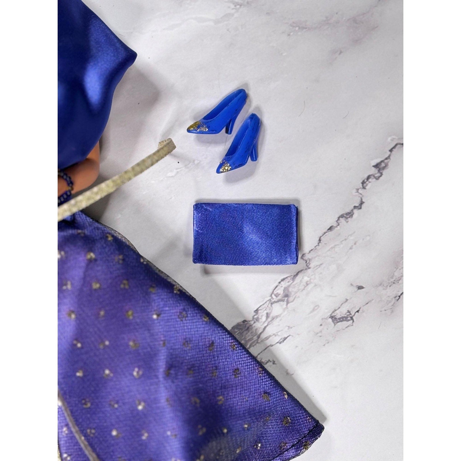 Purple Gold Dress Brunette Hair Barbie Doll glitter Shoes Scarf Wrap Shawl Purse